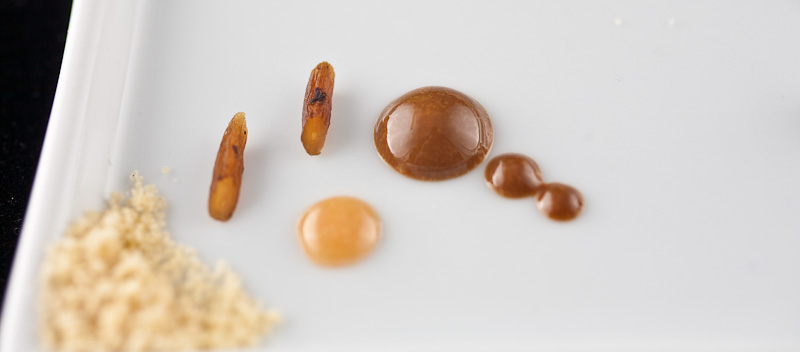 Let me back up for a minute here though and give you the setup: a mixture of chocolate, milk, honey, and vanilla is frozen into sort of a chocolate ice cube, at which point its sprayed with an atomized layer of chocolate from a paint sprayer. When refrigerated, the inner chocolate melts into a thick chocolate milk consistency while the outer chocolate stays solid, forming a delicate, lattice shell. This is plated and garnished with bitters toffee, chocolate sauce, candied dandelion root, banana powder, anise hyssop, and chicory root pudding.
