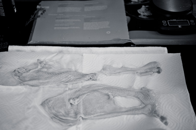 But whatever, I’ll talk about the rest of it now, because the rest of it was kick-ass. The main sphere there is made of chicken skin, corn, chicken fat powder, toasted bread with olive oil, and thyme. Using my newly-found butchery skills, I expertly relieved a nice little chicken of its skin.
