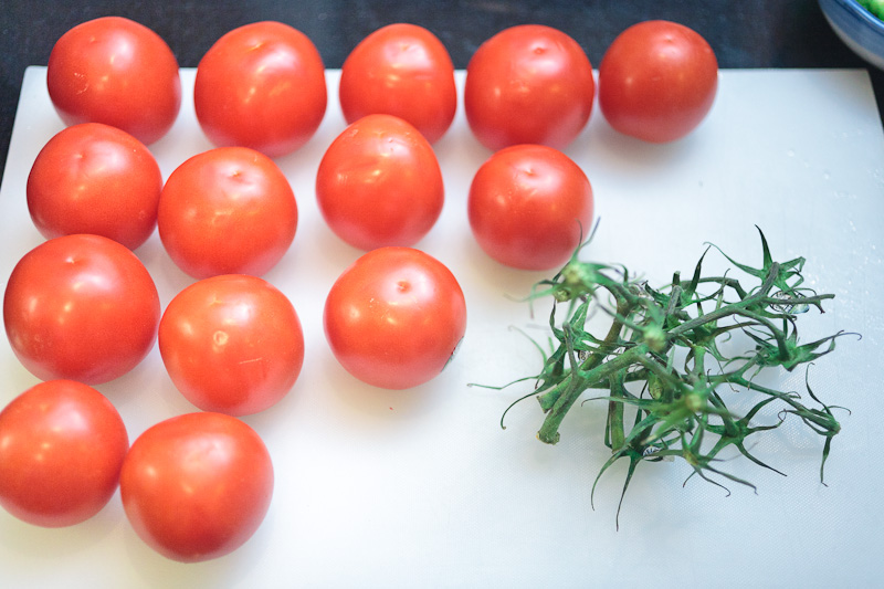 We start this recipe by making ‘tomato water’. This isn’t hard, but it isn’t fast either. Like Hugh Hefner these days (zing!). To make it, I’m supposed to use about 3.5 lbs of tomato scraps…something I might come across easily in a restaurant kitchen, but not so much at home. So I bought a bunch of vine-ripened tomatoes (I wanted something flavorful without being terribly expensive).