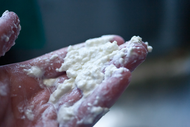 After letting this second batch drain for about 15 minutes, I dropped a ball of it into hot salted water to see what would happen. After about 5 minutes I pulled it out…it felt soft, but also had an odd rind on the outside. When I tried to knead it, it softened up immediately but then with further working it toughened up and started ripping. I tried this a few more times, increasingly frustrated with what looked increasingly like it wasn’t going to work.