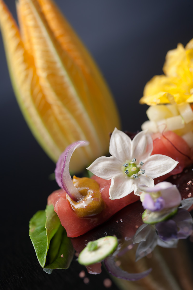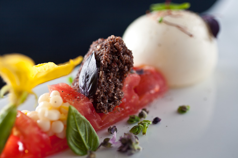 I’ll start by introducing all the stuff: a strip of tomato stretches out on the plate. The ‘wells’ formed by the various chambers in the tomato are filled with a cornucopia of flavors…from left to right we have some curry pudding with candied red onion sticks, a small salad of diced pickled cucumber, a baby cucumber with the blossom attached that’s been dipped in vinegar gel, lemon couscous, a ‘crumb rock’ made from toasted ciabatta, nicoise olive, and garlic, a gel spiral of molasses and saffron, and finally a balloon made of mozzarella that’s filled with tomato foam. The dish is garnished with fresh summer flowers and herbs: zucchini blossoms, purple and italian basil blossoms and leaves, and a sweet pepper flower just blooming fruit.